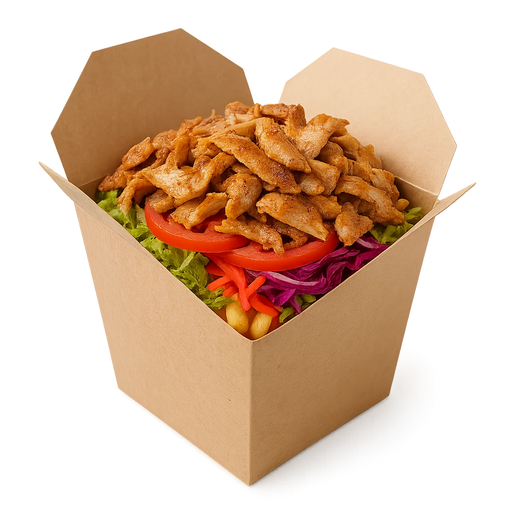 Zartes Hühnerfleisch direkt vom Spieß, serviert auf knusprigen Pommes mit frischem Salat, Tomaten, Zwiebeln und cremiger Souce